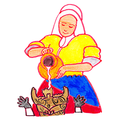 井上涼 Inoue Ryo 今日描いたイラスト 餅にすら牛乳を注ぐ何にでも牛乳を注ぐ女 除夜の鐘をつく忍者 鏡餅の上の座を争うりんごとオレンジ